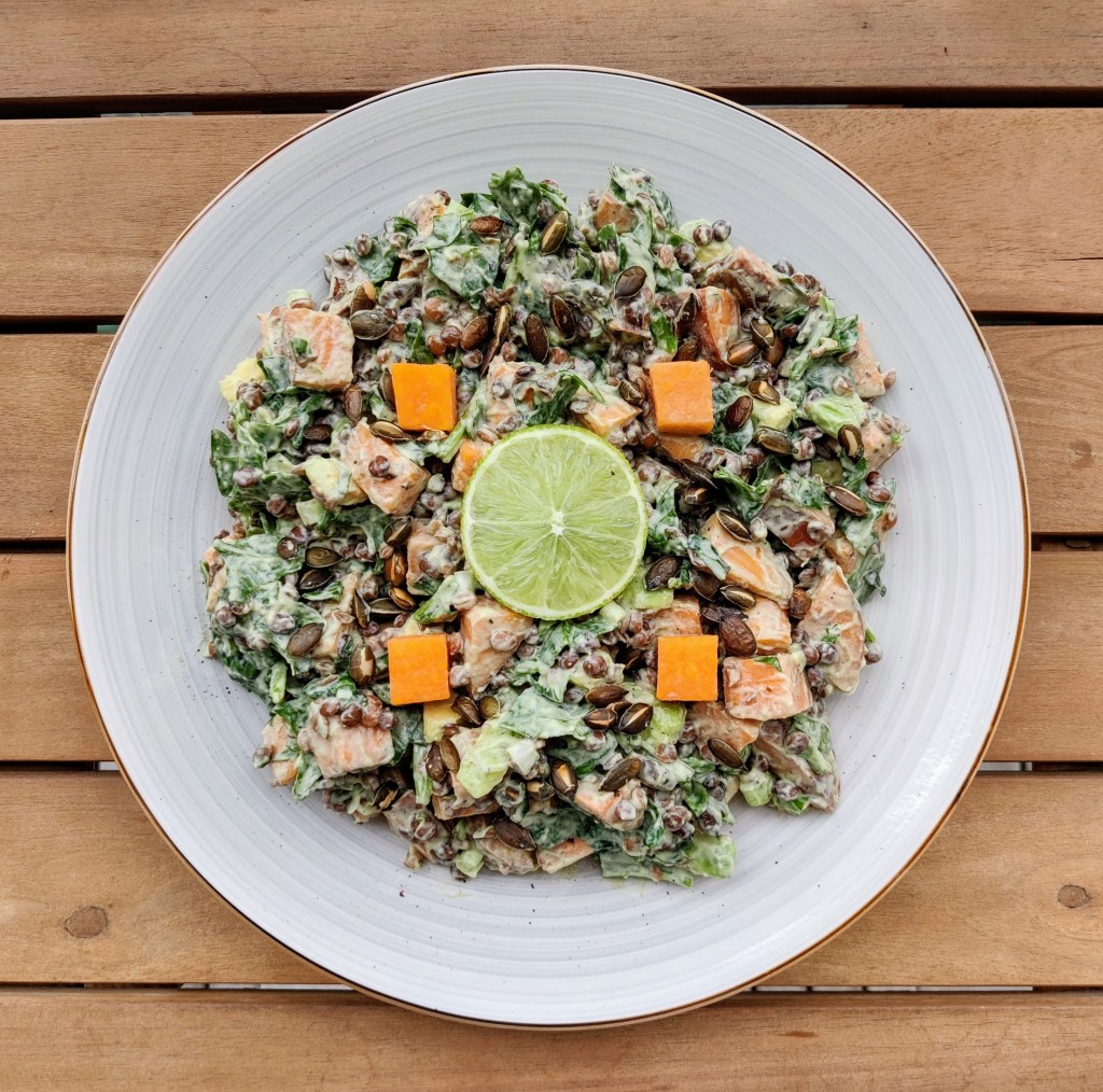 - Snijd de bosui in kleine stukjes en snijd de spinazie fijn. Als de zoete-aardappelblokjes eenmaal redelijk zijn afgekoeld, voeg deze dan met de bosui en spinazie toe aan de kom met de saus. Spoel de linzen af in een vergiet en laat ze uitlekken. Snijd de avocado in blokjes van ongeveer 1x1cm. Meng de avocado zo snel mogelijk na het snijden met de ingrediënten in de grote kom zodat deze niet gaat verkleuren (het limoensap gaat dit tegen) en voeg ook de linzen hieraan toe. Haal de basilicumblaadjes van de takjes en scheur deze in grove stukken. Meng de basilicum en de helft van de pompoenpitten ook met de salade. Breng de salade op smaak met lekker veel (zwarte) peper en eventueel zout.